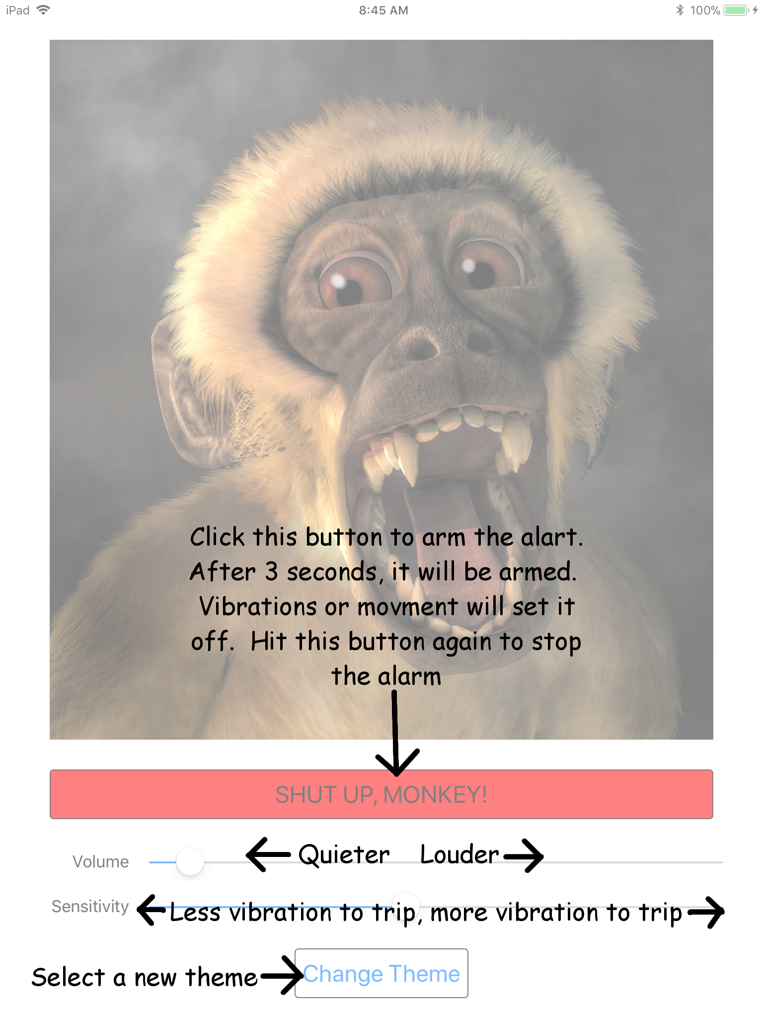 Screaming Monkey is a humorous motion alarm for your IPhone, IPad, or ITouch device. Once armed, screaming monkey will sound an audible alarm if the IOS device is moved and will continue until Screaming Monkey is disarmed or the app is terminated. Volume and sensitivity are easily adjustable.
